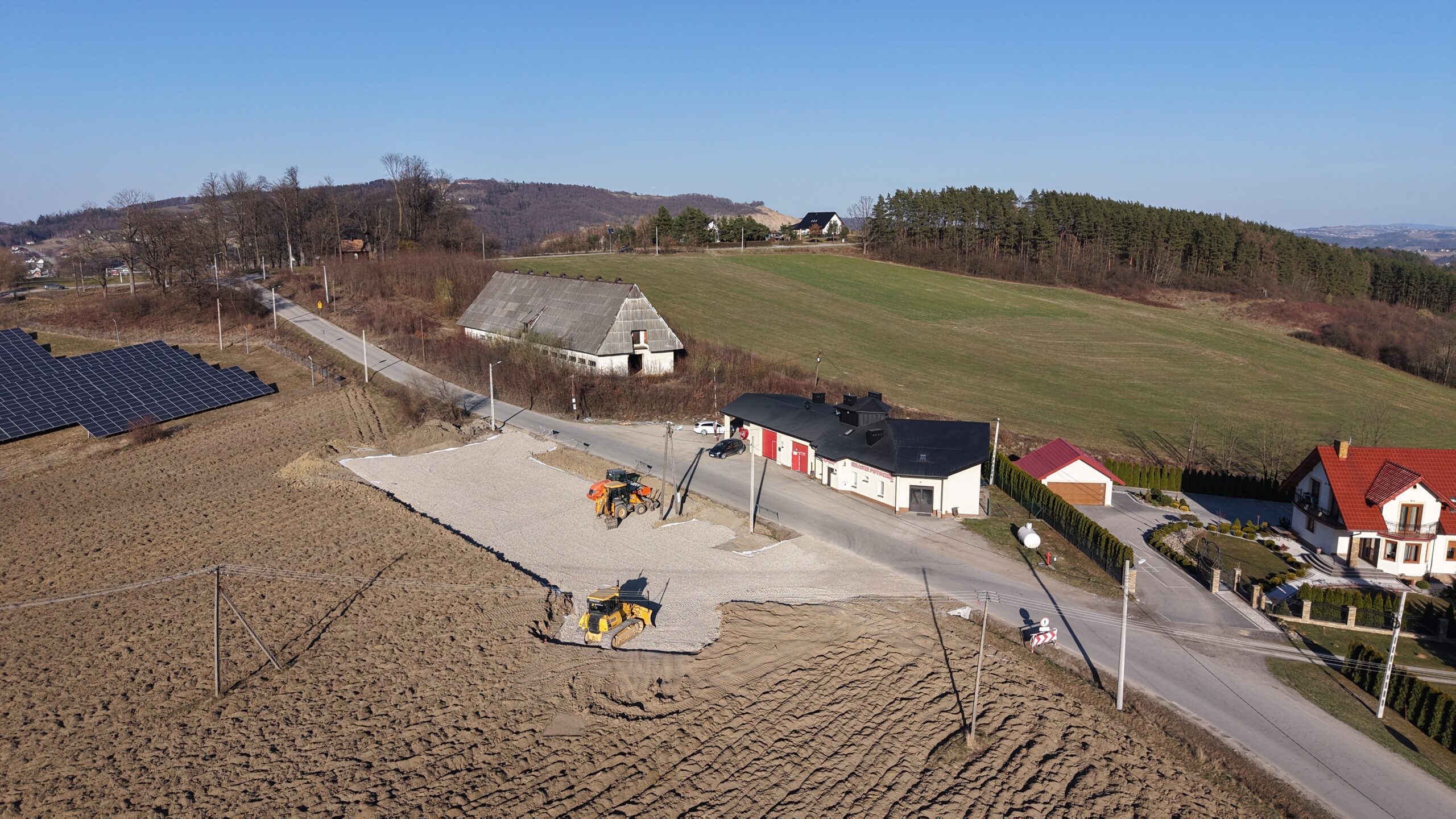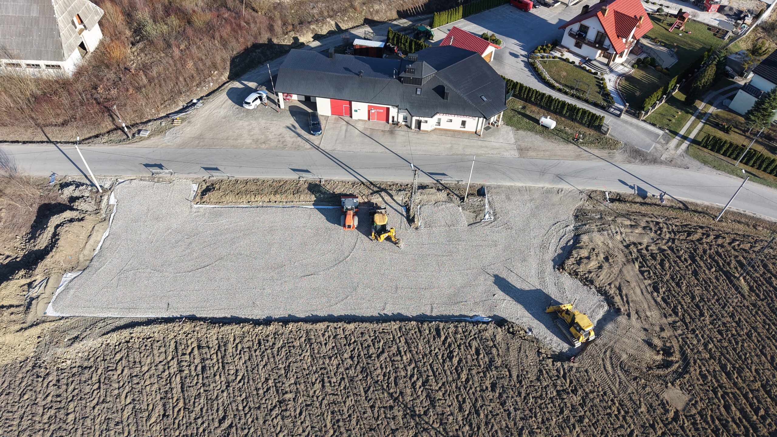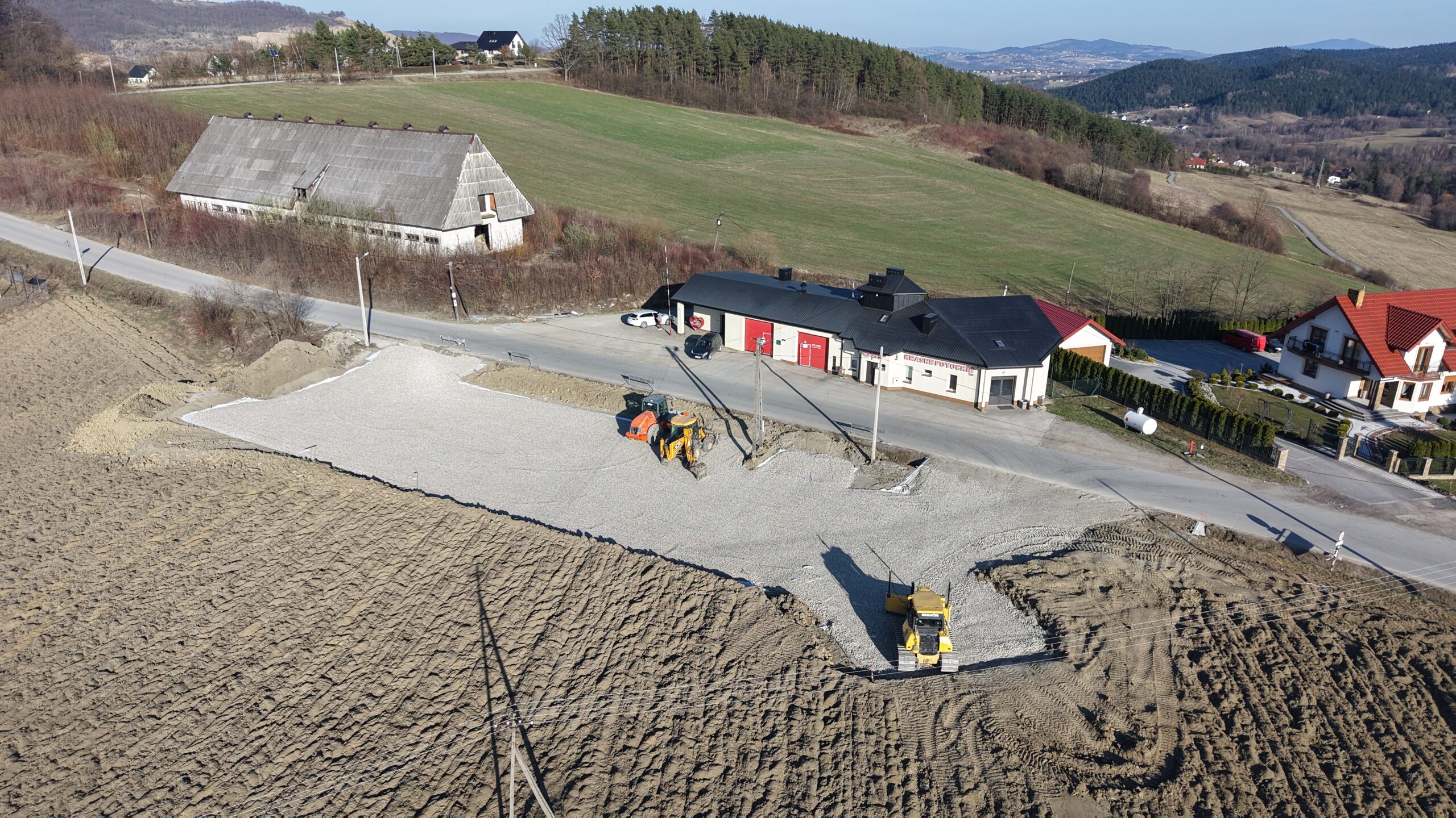 Na placu obok budynku OSP Krasne Potockie prowadzone są już prace przygotowawcze pod budowę parkingu. Teren został wyrównany i utwardzony, a kolejnym etapem będzie wykonanie nawierzchni oraz wyznaczenie miejsc postojowych.