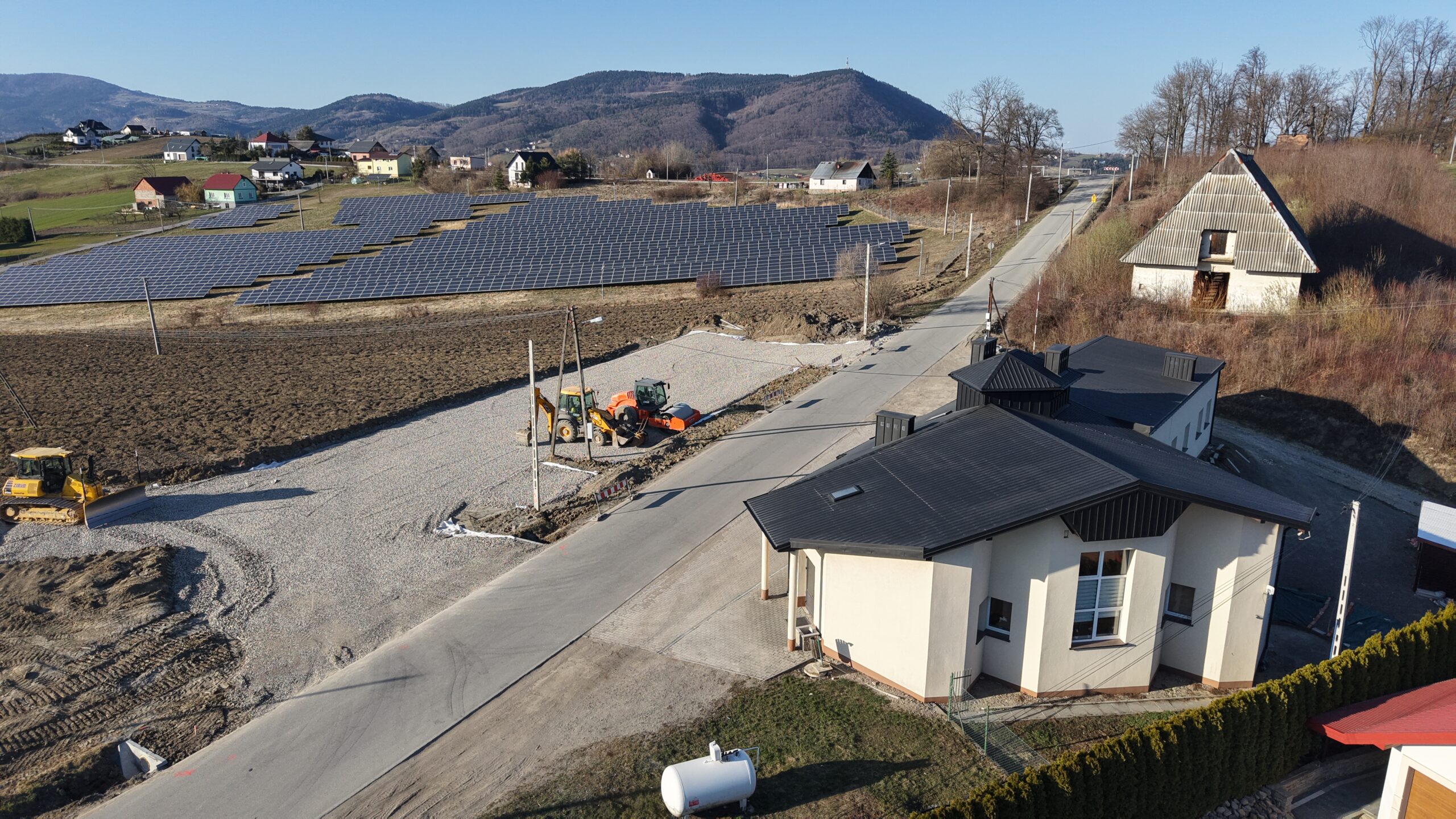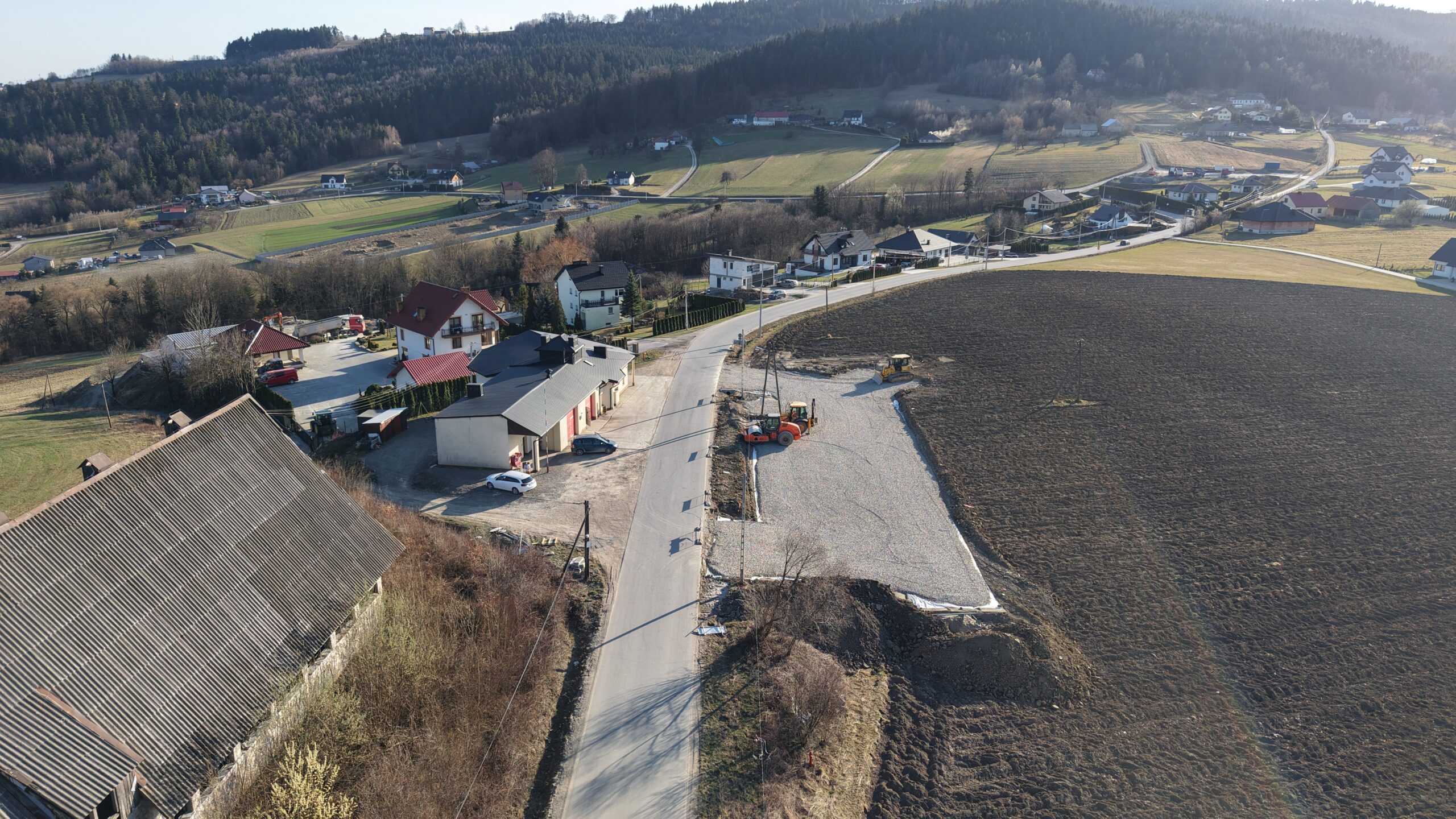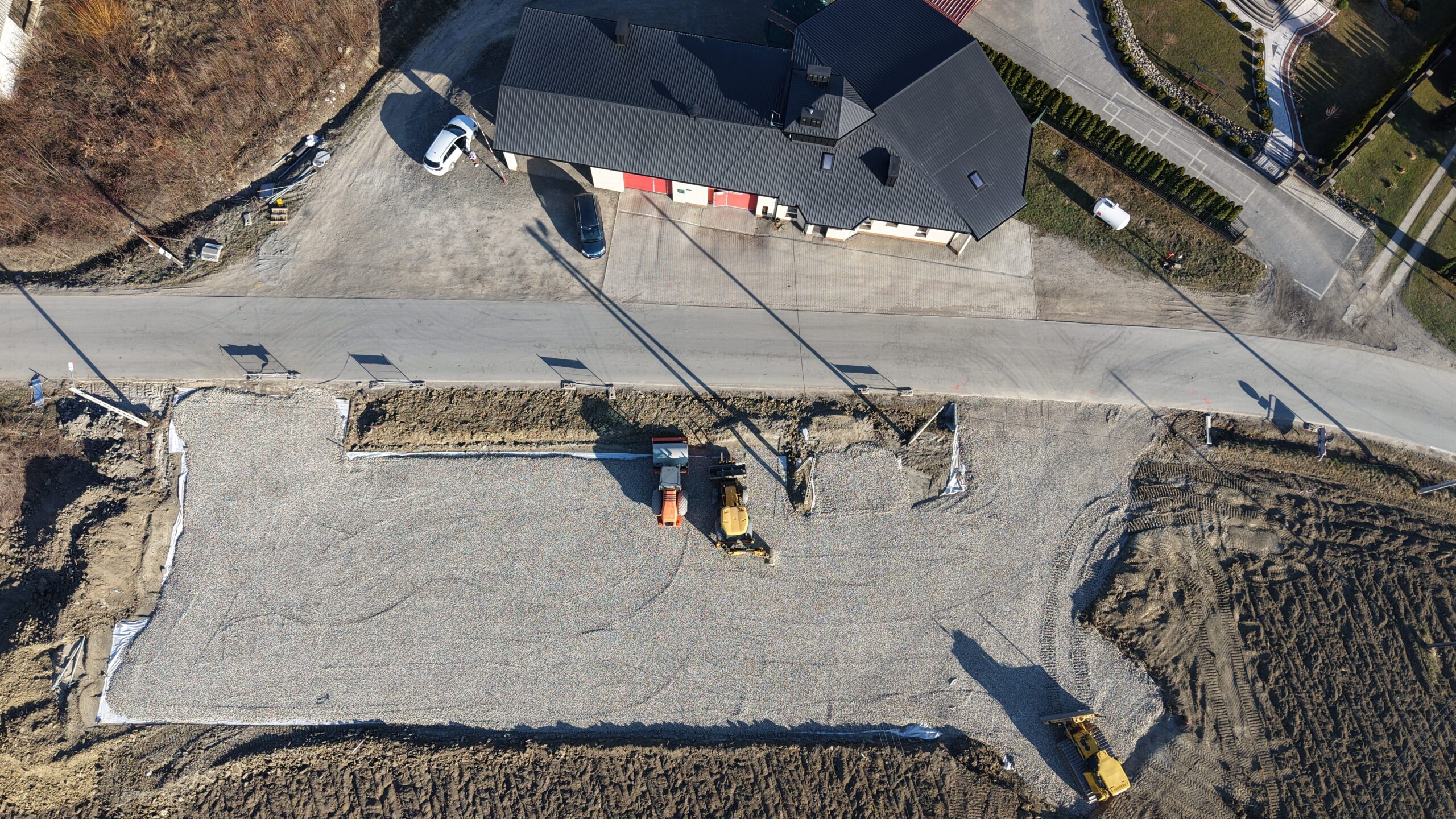 Na placu obok budynku OSP Krasne Potockie prowadzone są już prace przygotowawcze pod budowę parkingu. Teren został wyrównany i utwardzony, a kolejnym etapem będzie wykonanie nawierzchni oraz wyznaczenie miejsc postojowych.