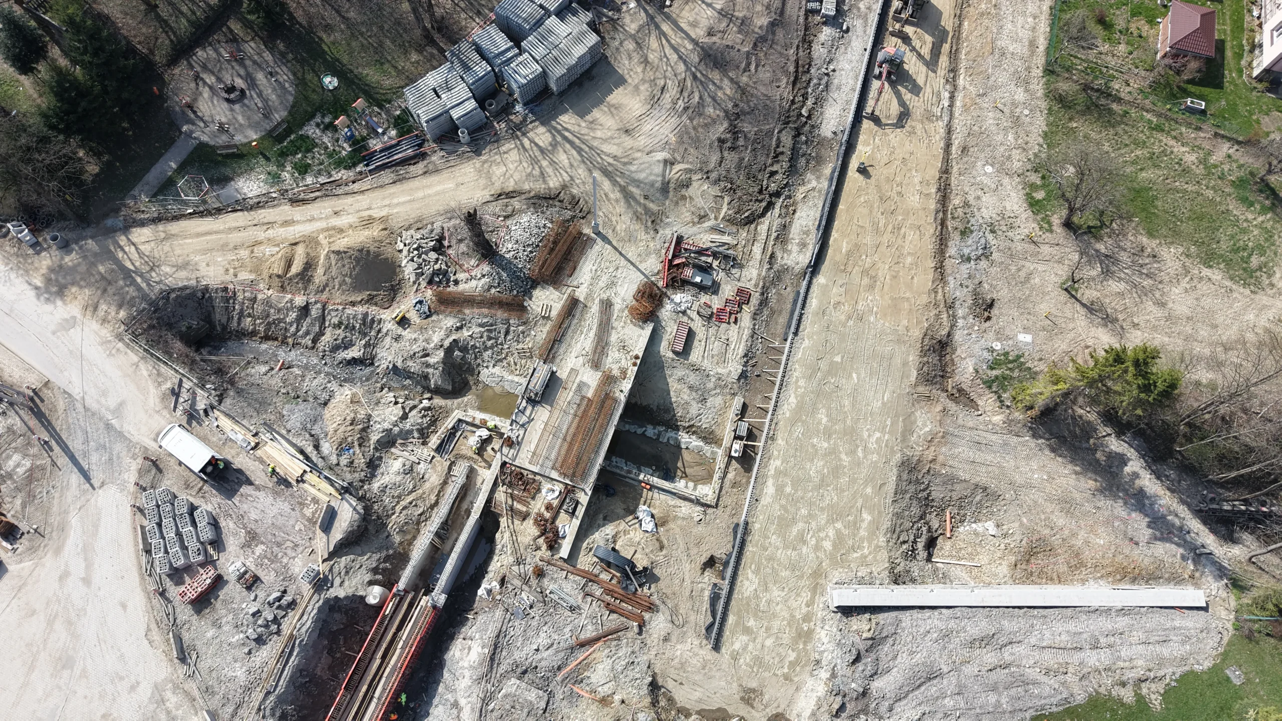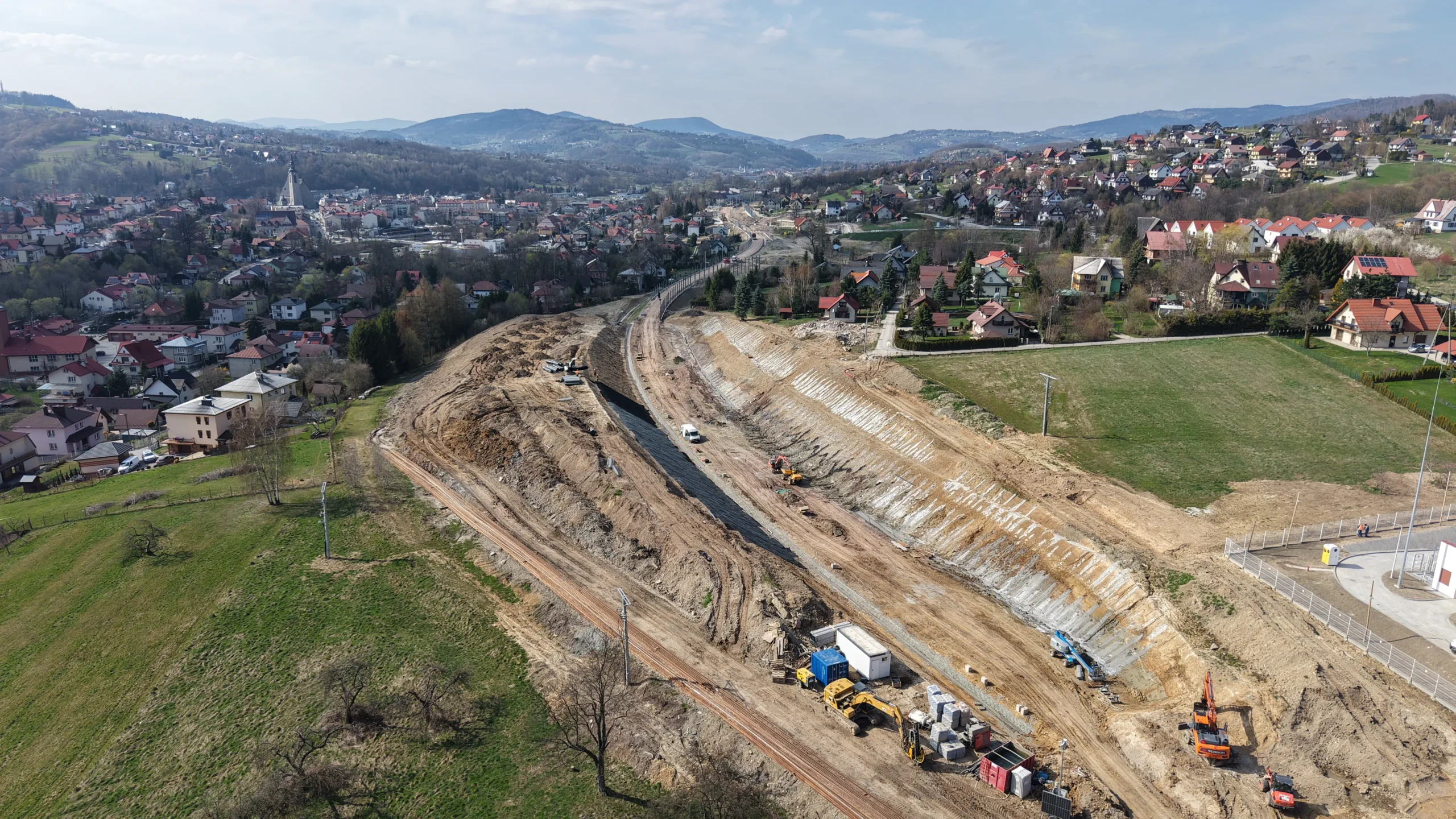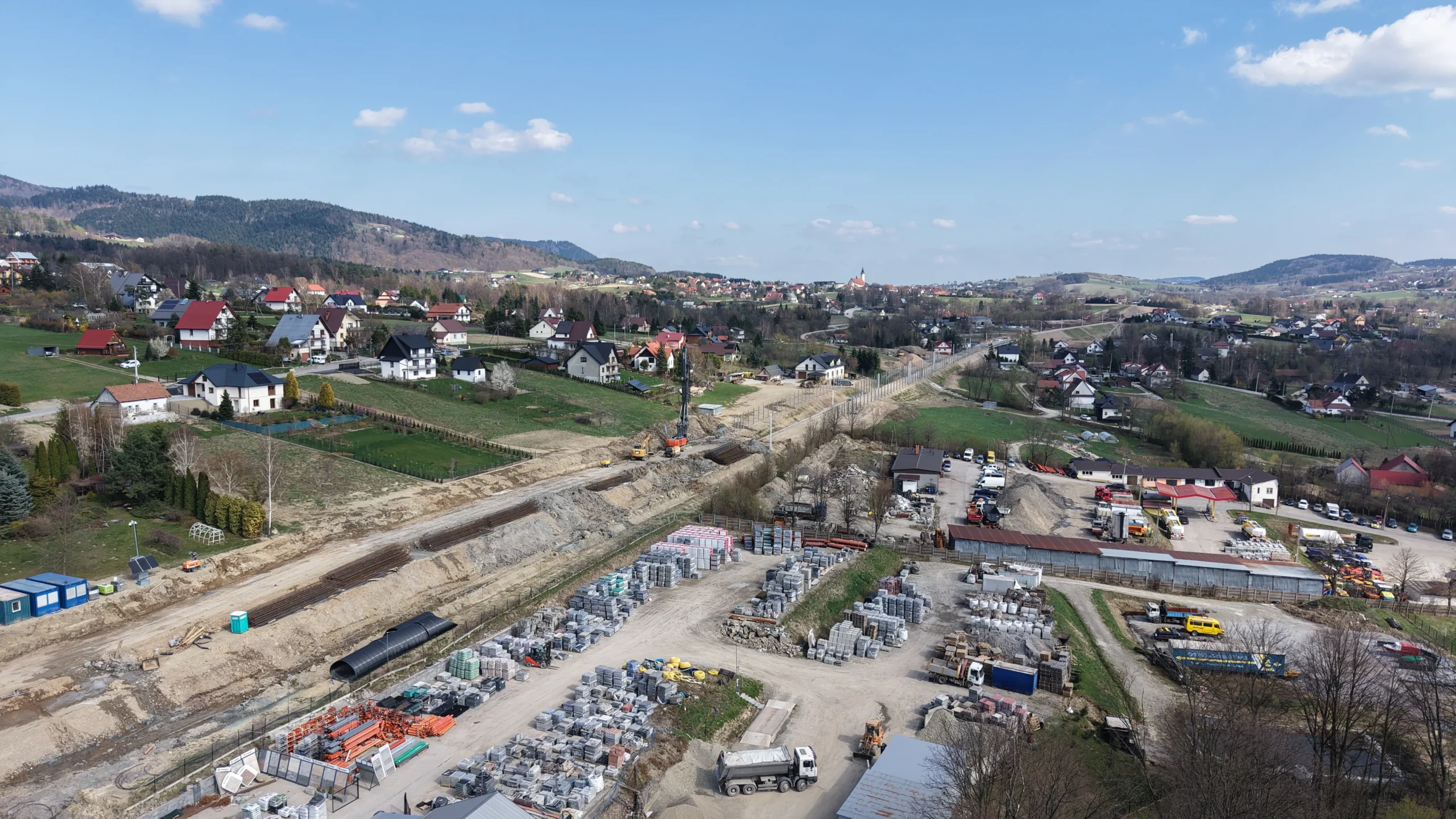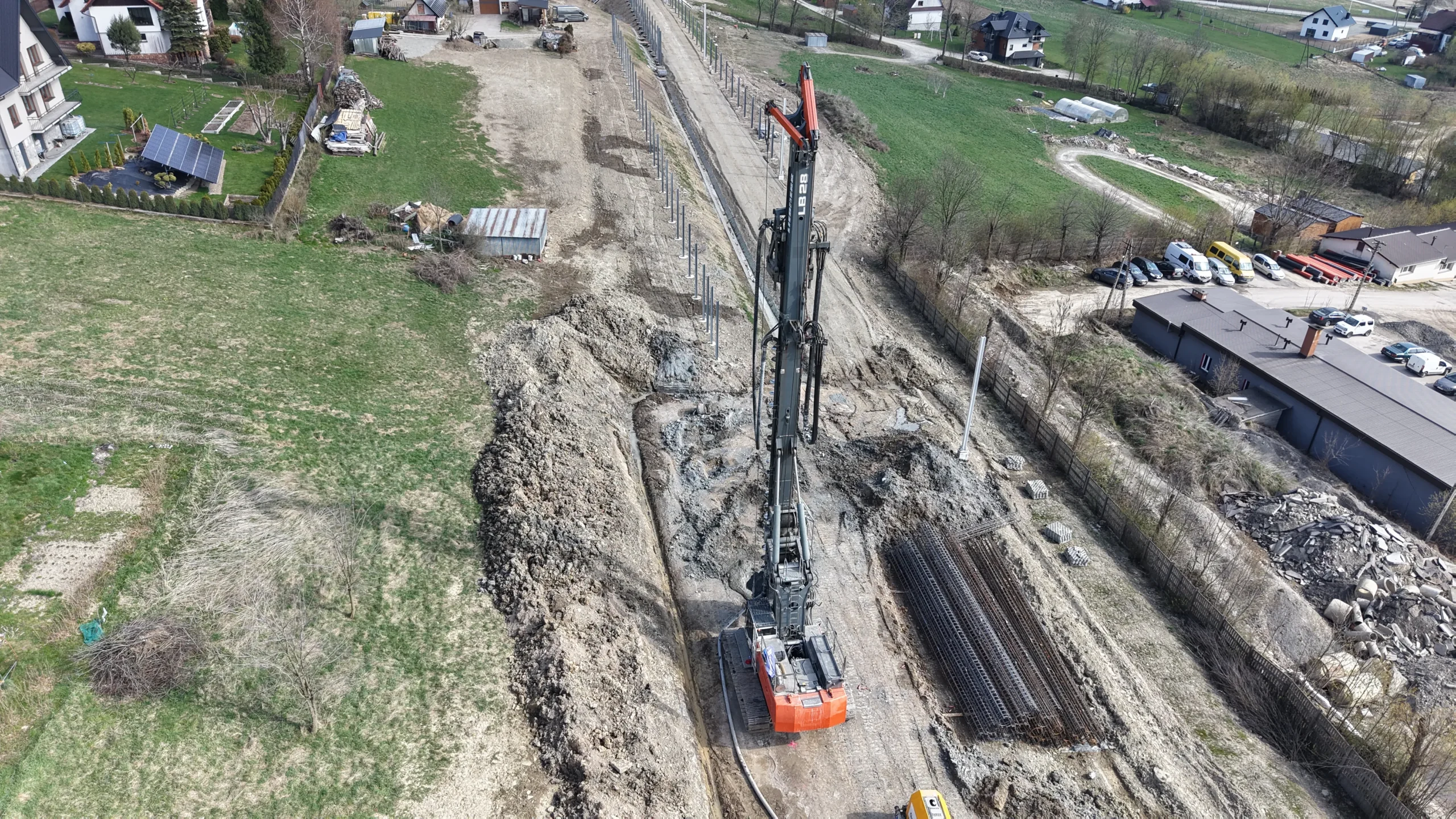 Prowadzone są roboty ziemne związane z formowaniem przyszłego nasypu kolejowego. Teren został przekształcony – widoczne są wykopy, drogi technologiczne oraz miejsca składowania materiałów budowlanych. Wzdłuż planowanego przebiegu torów trwają również prace palowe, związane ze wzmocnieniem podłoża.