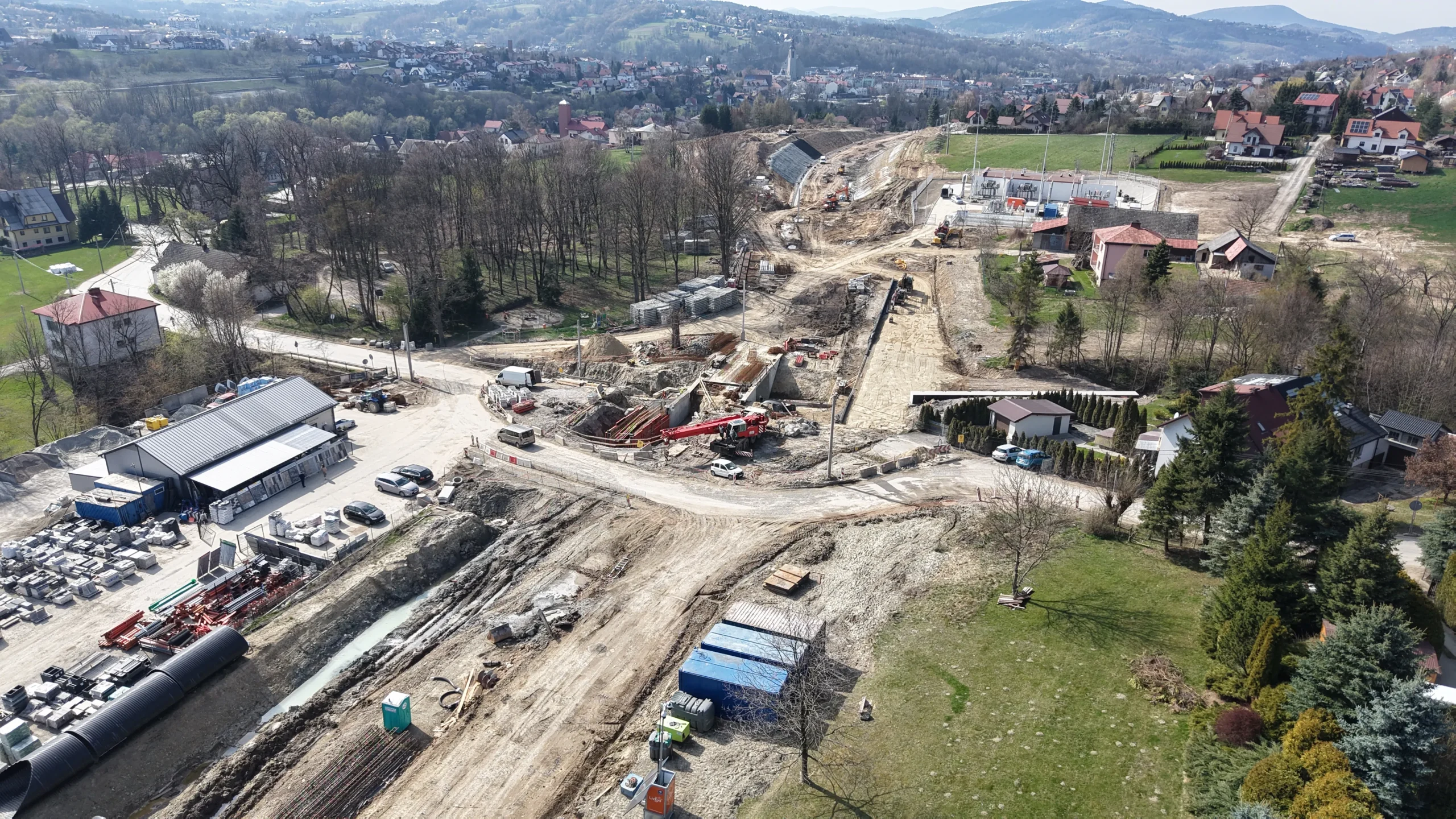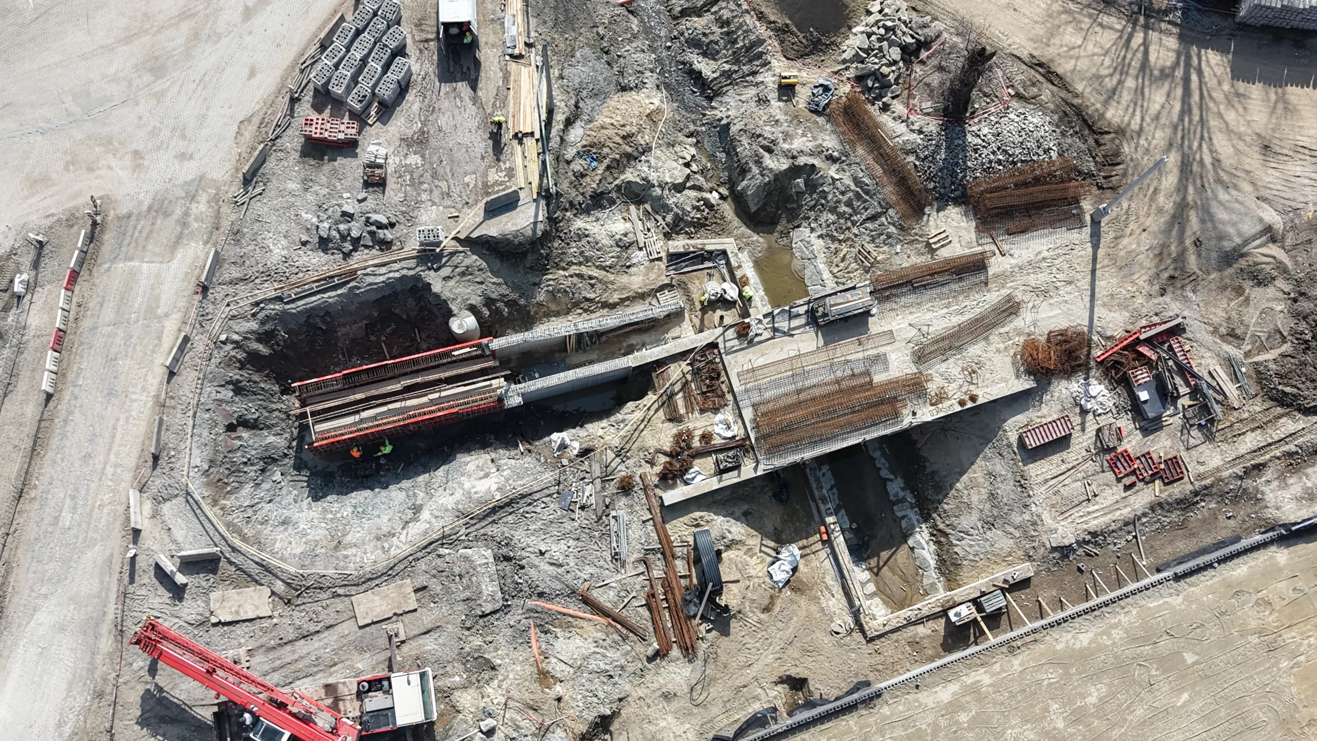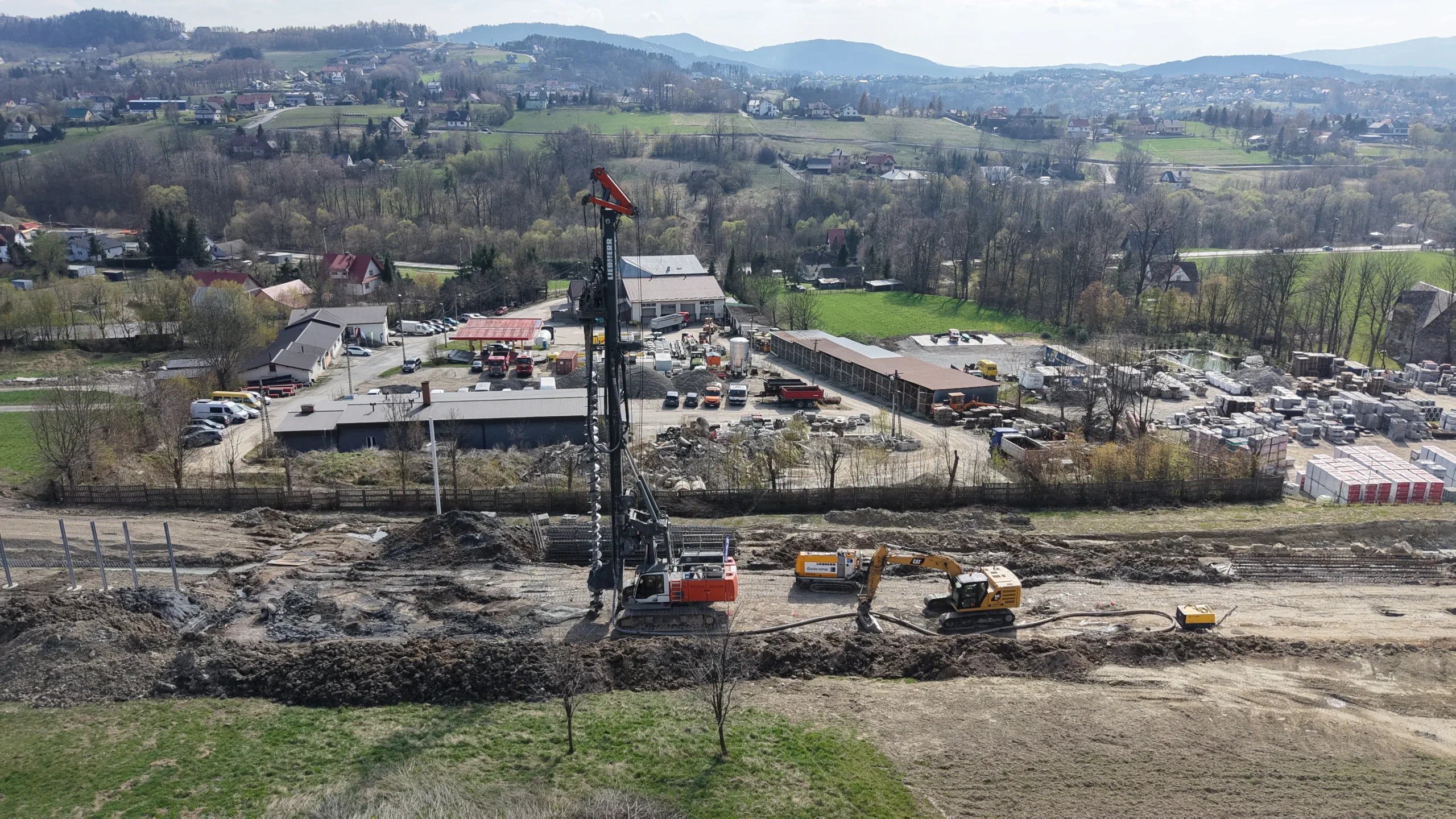 Prowadzone są roboty ziemne związane z formowaniem przyszłego nasypu kolejowego. Teren został przekształcony – widoczne są wykopy, drogi technologiczne oraz miejsca składowania materiałów budowlanych. Wzdłuż planowanego przebiegu torów trwają również prace palowe, związane ze wzmocnieniem podłoża.