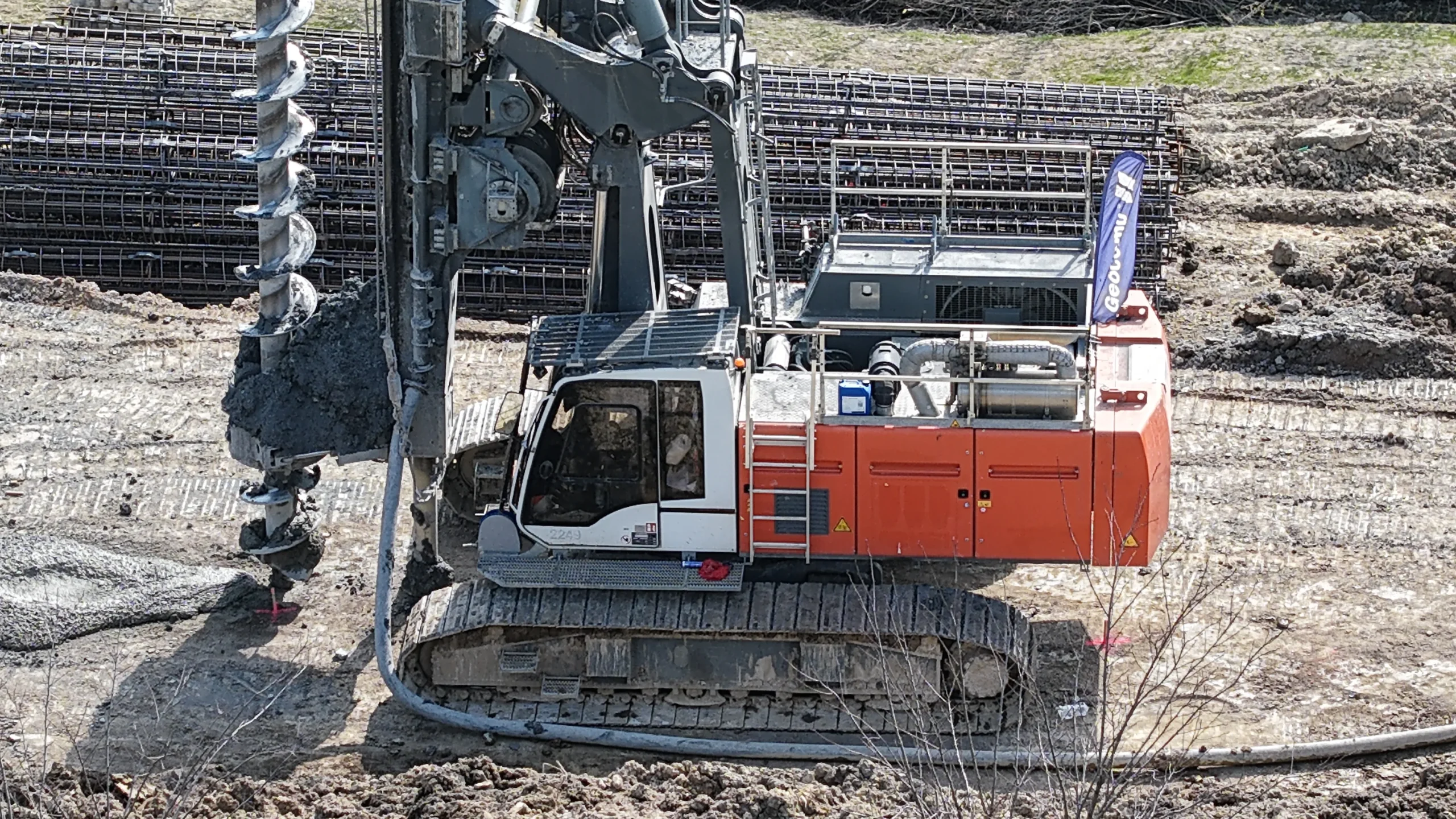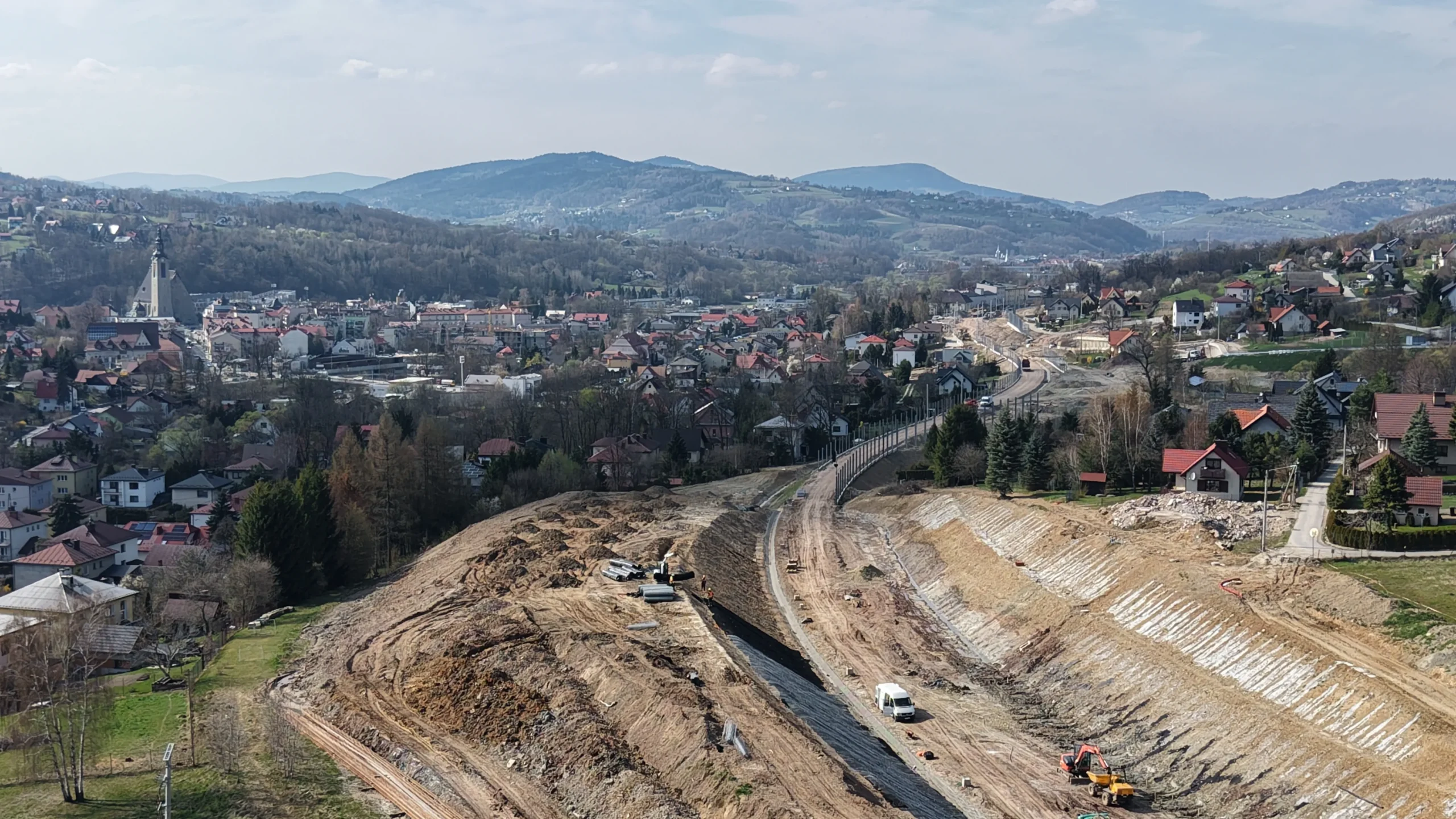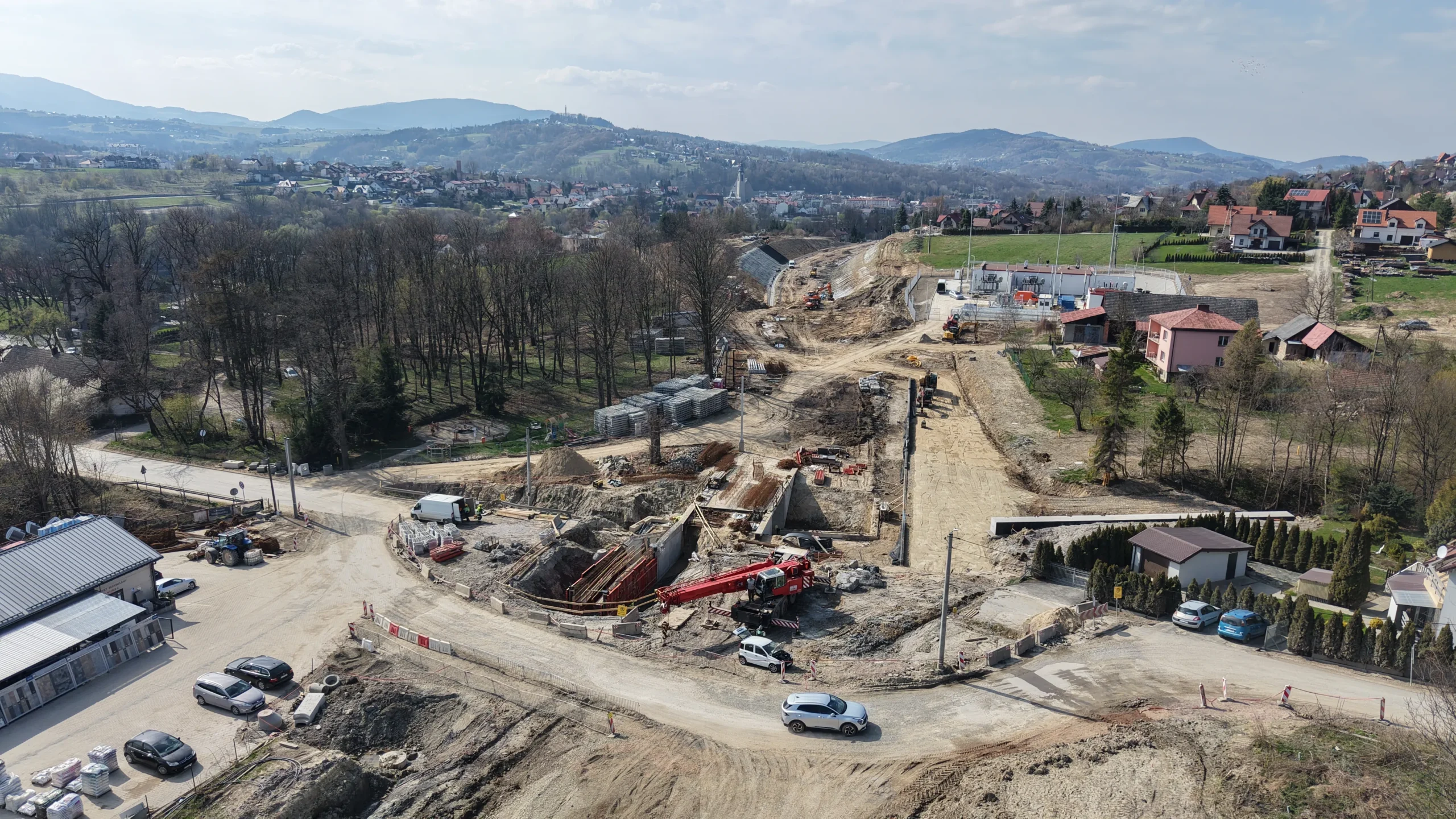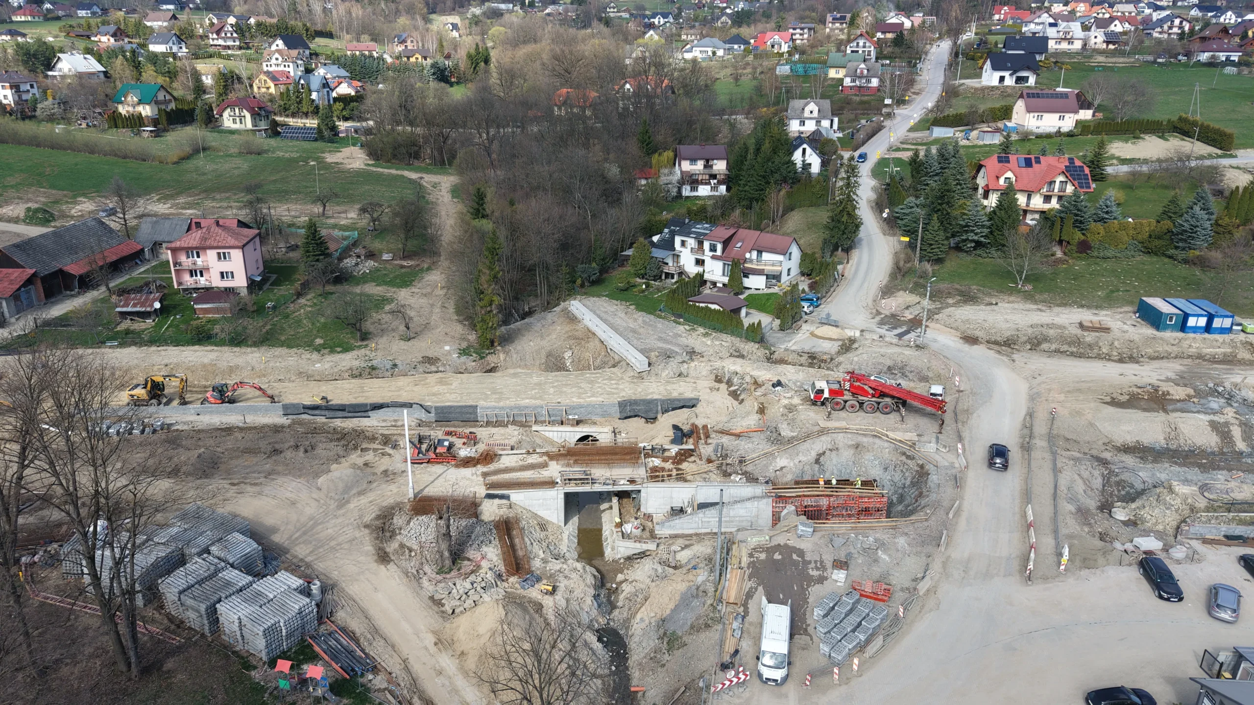 Prowadzone są roboty ziemne związane z formowaniem przyszłego nasypu kolejowego. Teren został przekształcony – widoczne są wykopy, drogi technologiczne oraz miejsca składowania materiałów budowlanych. Wzdłuż planowanego przebiegu torów trwają również prace palowe, związane ze wzmocnieniem podłoża.