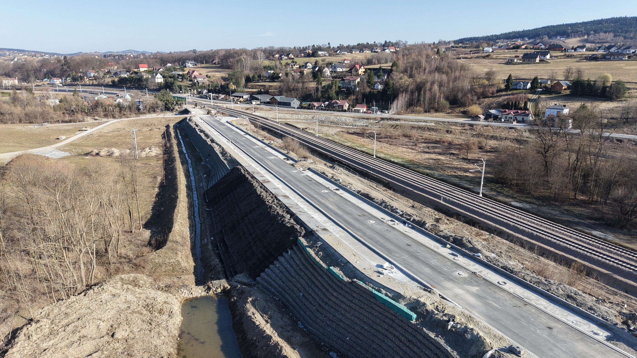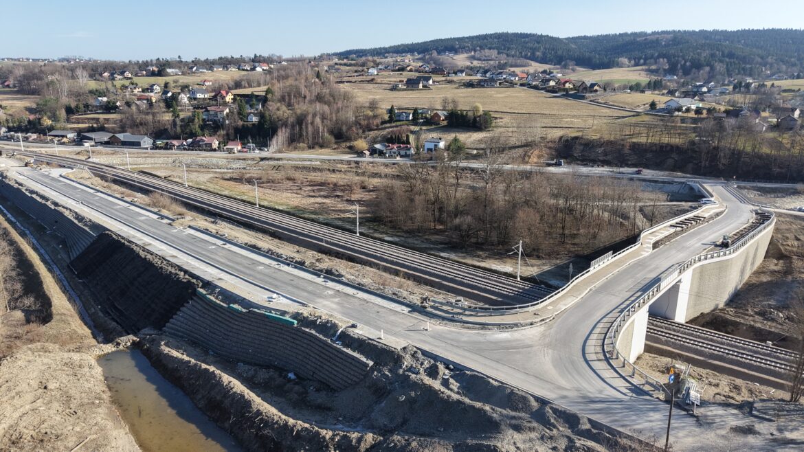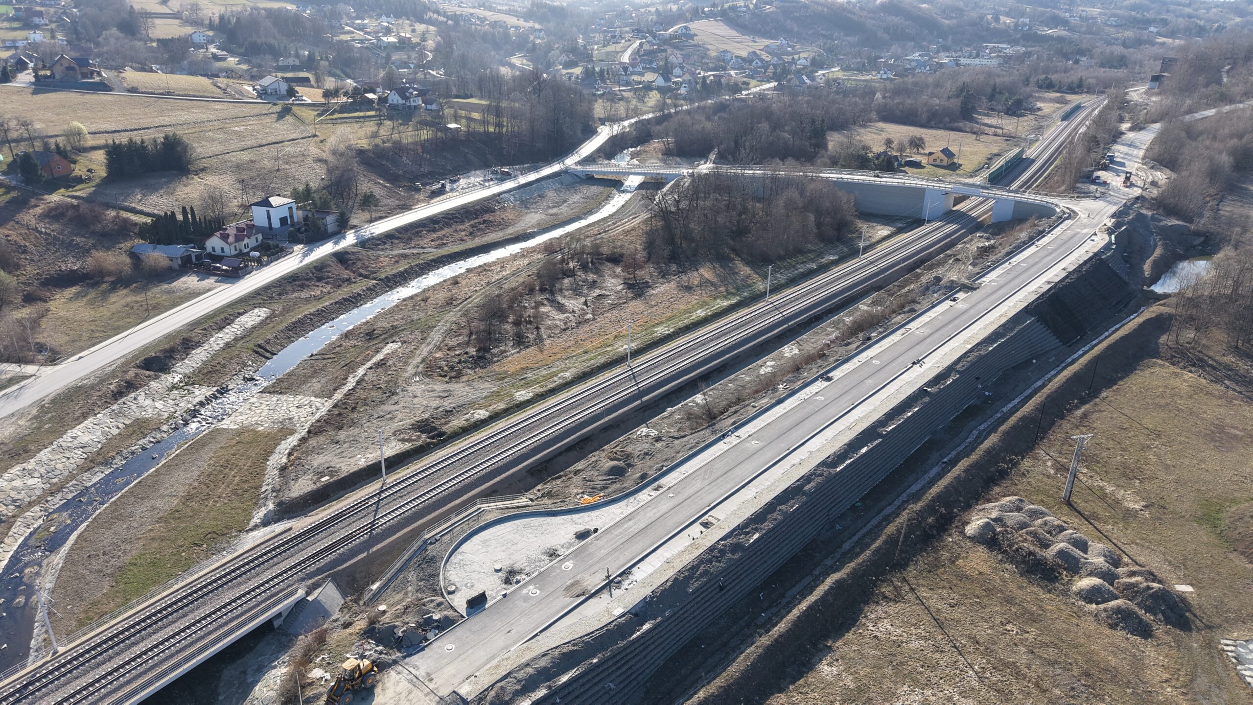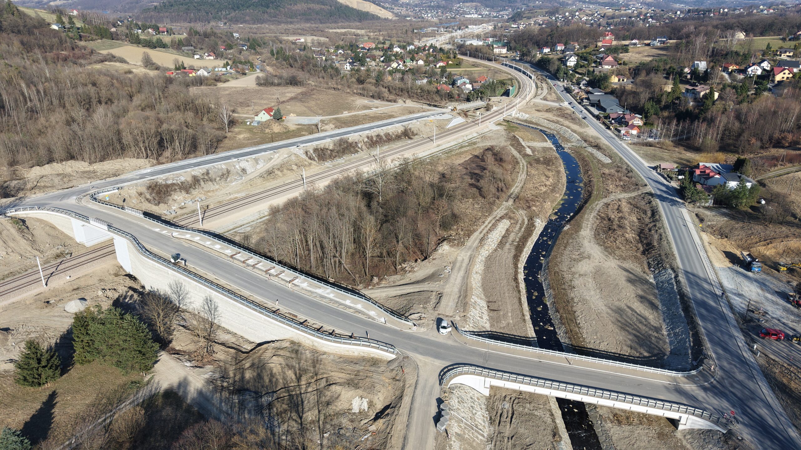 W centralnej części inwestycji powstał nowy wiadukt drogowy nad linią kolejową nr 104, który zastąpi dawny przejazd kolejowo-drogowy. Dzięki temu w przyszłości ruch samochodowy będzie odbywał się bezkolizyjnie, co znacząco poprawi bezpieczeństwo oraz płynność komunikacji w tej części Sądecczyzny. Z lotu ptaka doskonale widać nowy układ drogowy prowadzący na wiadukt oraz przebudowane skrzyżowania, które połączą lokalne drogi z nową przeprawą nad torami.