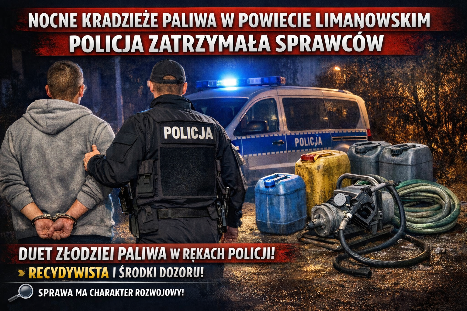 Policjanci z Limanowej rozbili grupę odpowiedzialną za serię kradzieży oleju napędowego, do których dochodziło w ostatnich dniach na terenie powiatu. Dwóch młodych mężczyzn wpadło w ręce funkcjonariuszy – straty sięgają kilku tysięcy złotych.