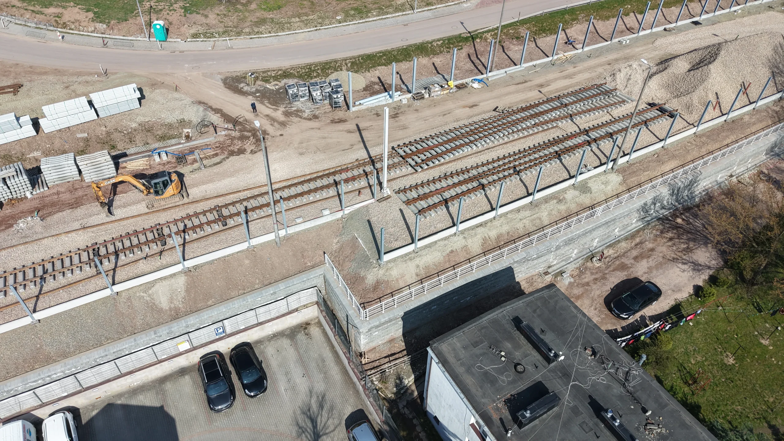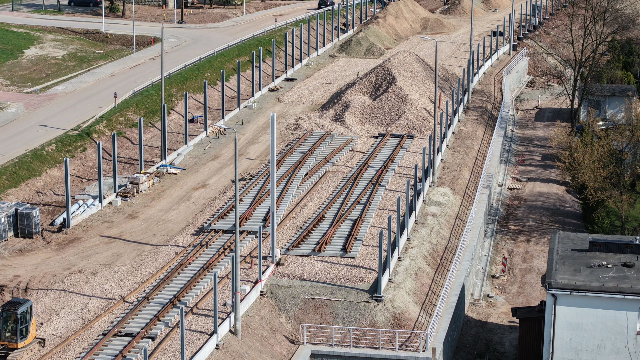 Budowa sieci trakcyjnej – montaż słupów i fundamentów pod przewody zasilające