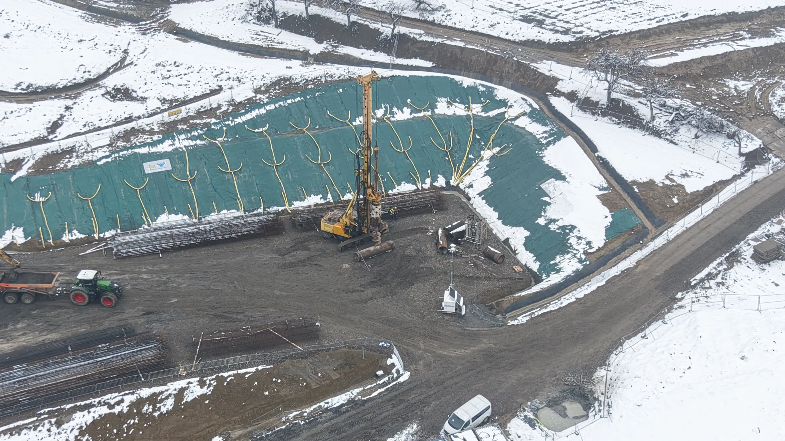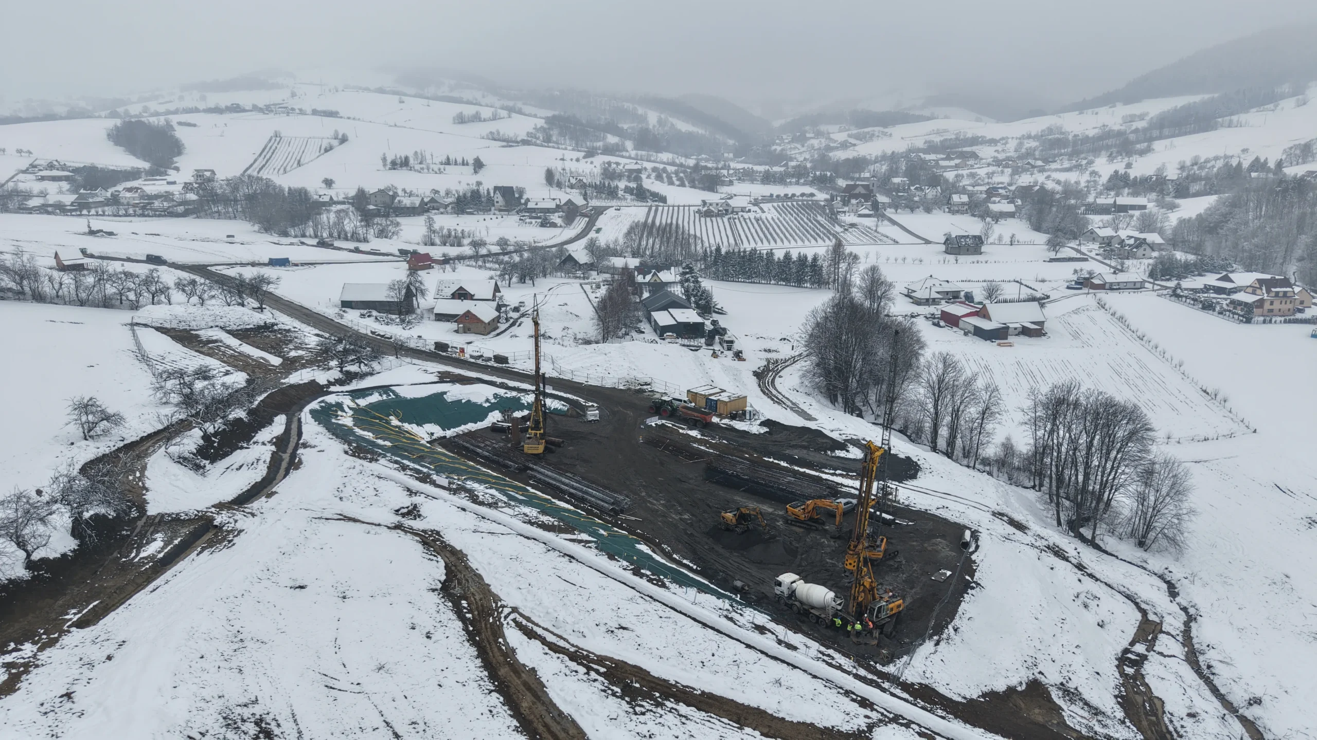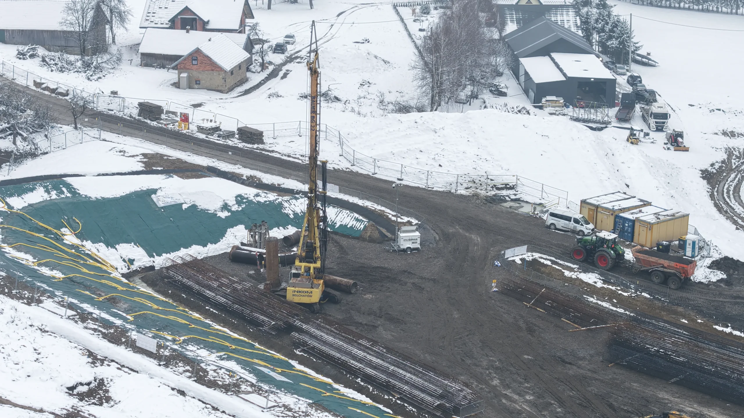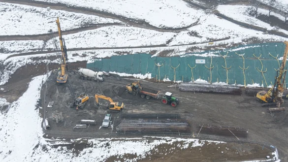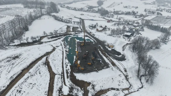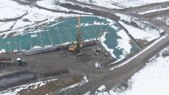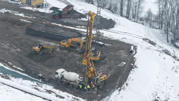 Nowe zdjęcia z drona pokazują, że teren budowy dynamicznie się przeobraża – od wbijania pali fundamentowych, przez prace ziemne, aż po tworzenie dróg technologicznych i formowanie portalu przyszłego tunelu.