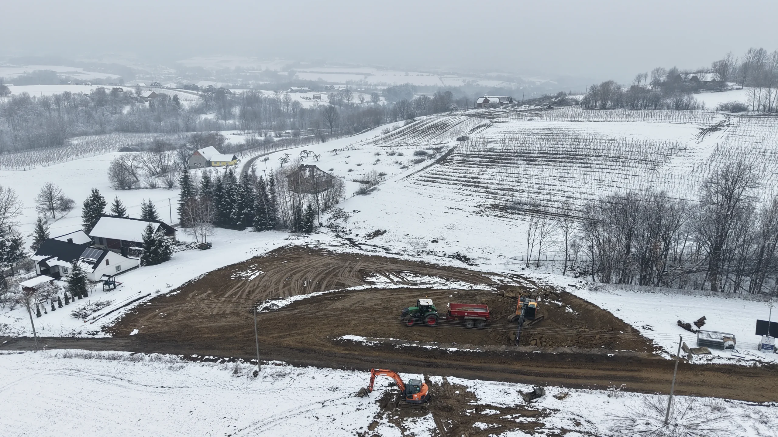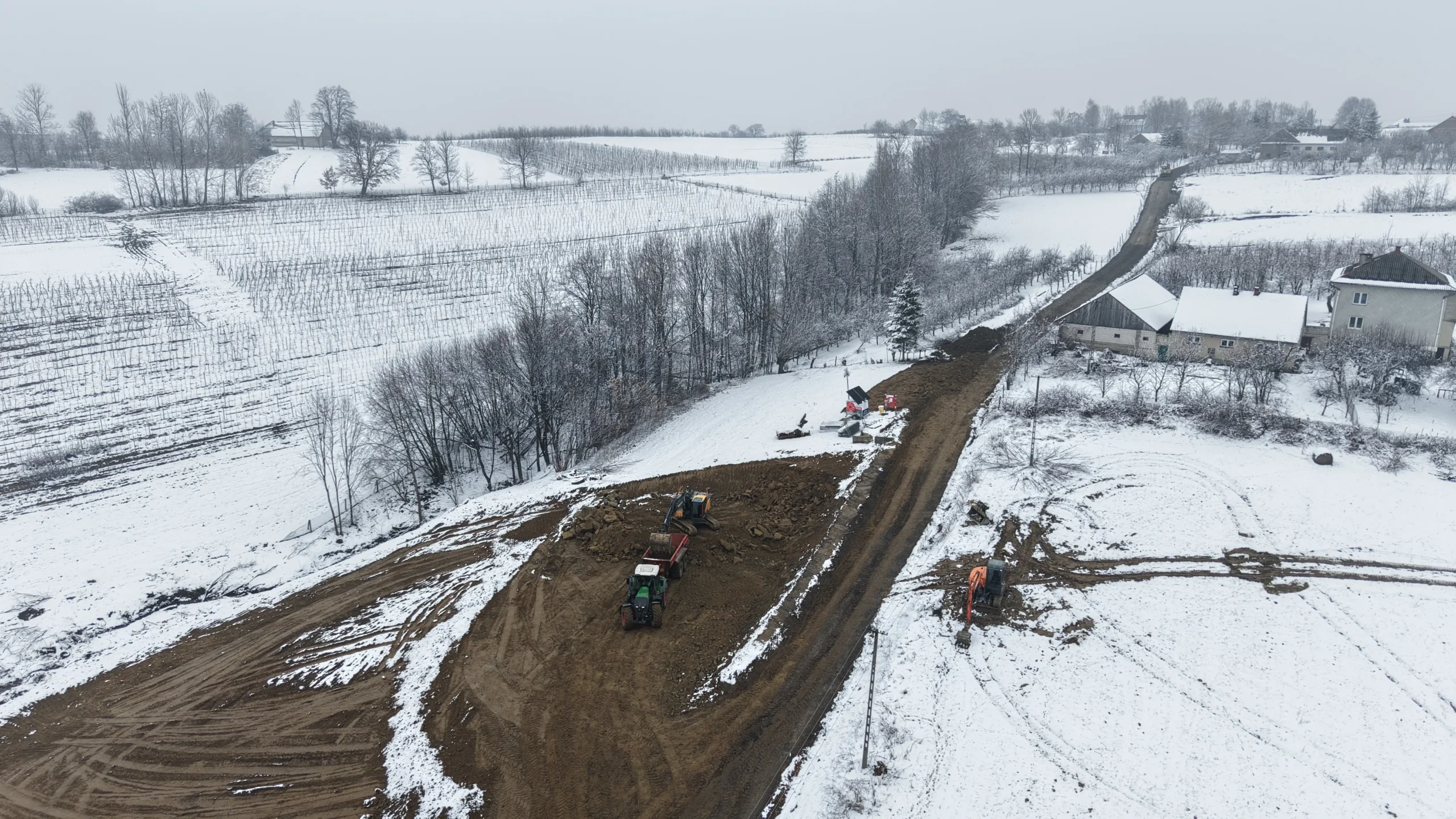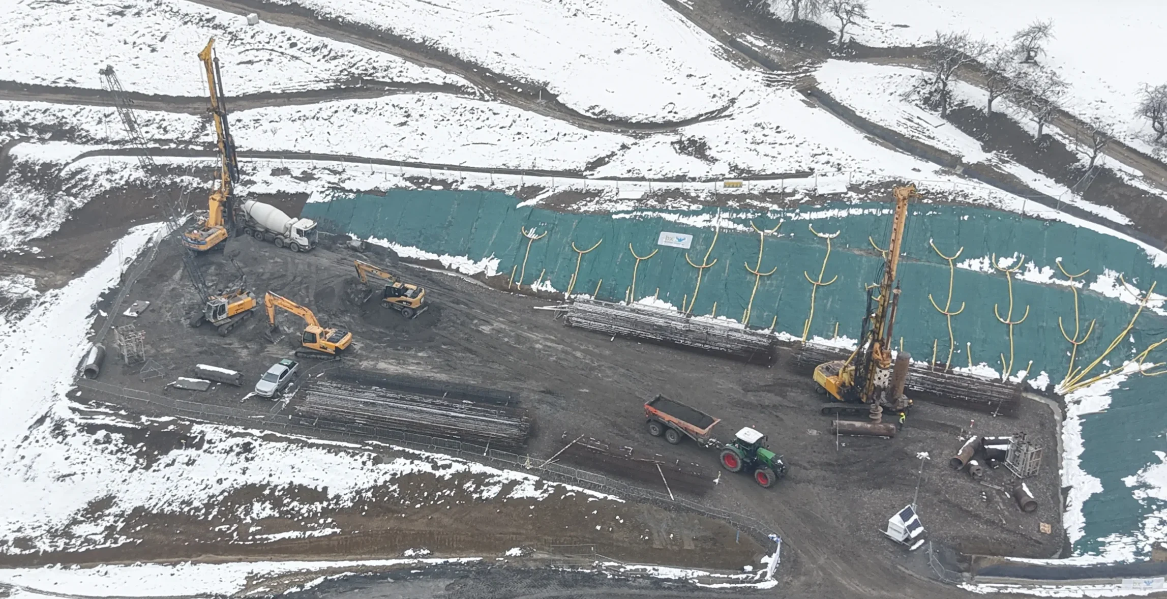 Nowe zdjęcia z drona pokazują, że teren budowy dynamicznie się przeobraża – od wbijania pali fundamentowych, przez prace ziemne, aż po tworzenie dróg technologicznych i formowanie portalu przyszłego tunelu.